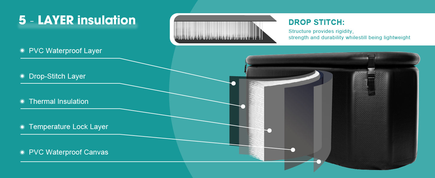 - Leak-Proof Valve & Easy Setup:Features a precision-engineered dual-action valve system that ensures airtight sealing to prevent leaks, while allowing fast inflation and deflation—so you can set up, drain, and move your ice bath in minutes