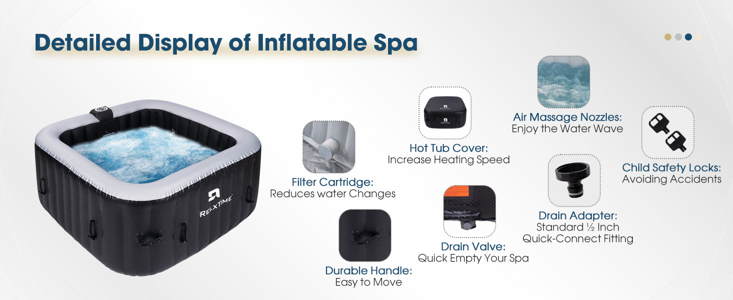 - HOT TUB WITH BUBBLE MASSAGE: The RELXTIME inflatable hot tub ideal for 2-3 person and heats up to a soothing 104 °F (40 °C) with 120 high-powered bubble jets. Bubbles come up from floor but it massages your lower and upper back, it not like jets but it feels good and relaxing.
