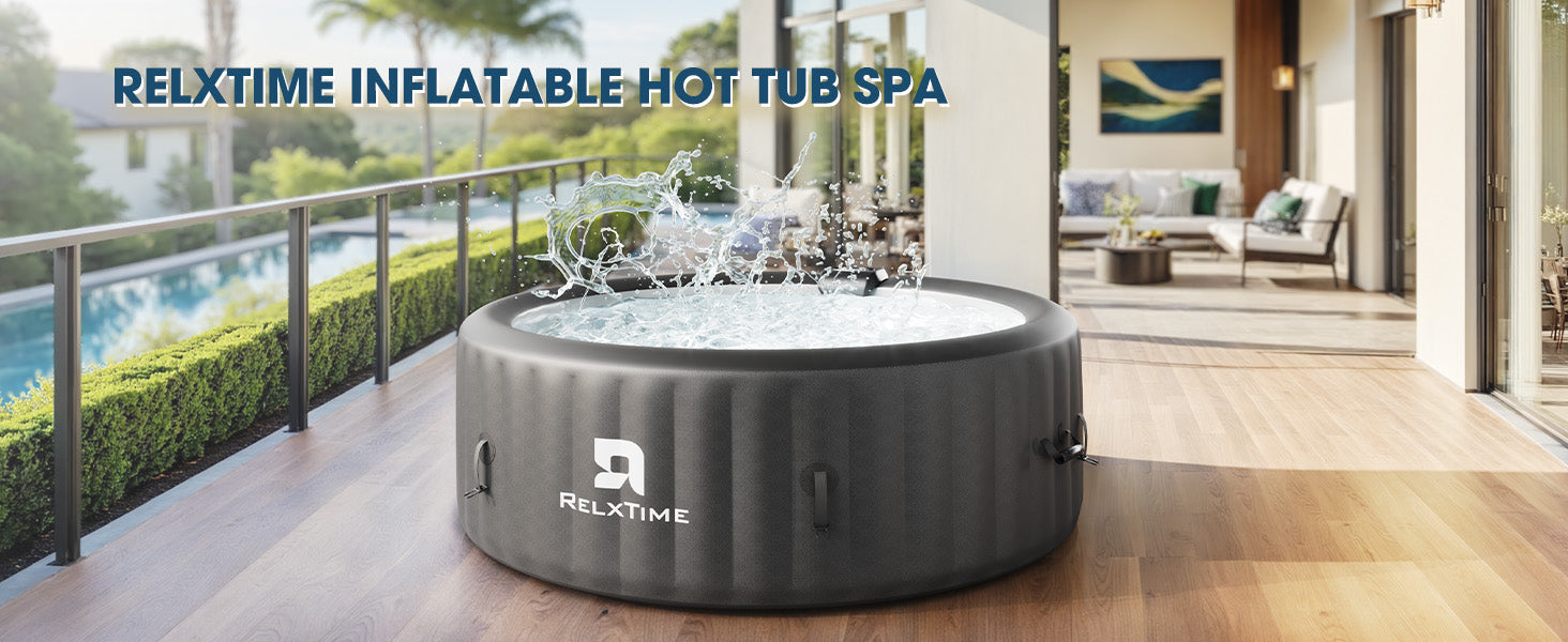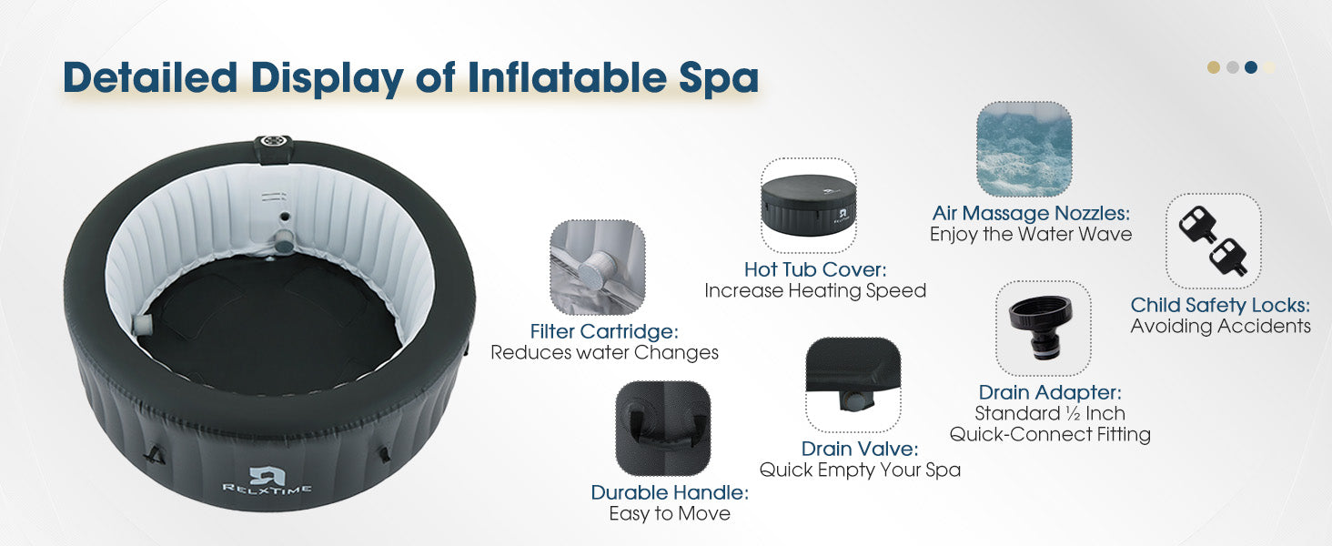 🌊2-4 Persons Inflatable Hot Tub: RELXTIME inflatable spa with 110 soothing high-powered bubble jets and a built-in integrated water filtration system to keep the water inside clean. The built-in 4-seat cushions that won't move, allow you to sit comfortably in the hot tub spa and avoid slipping.