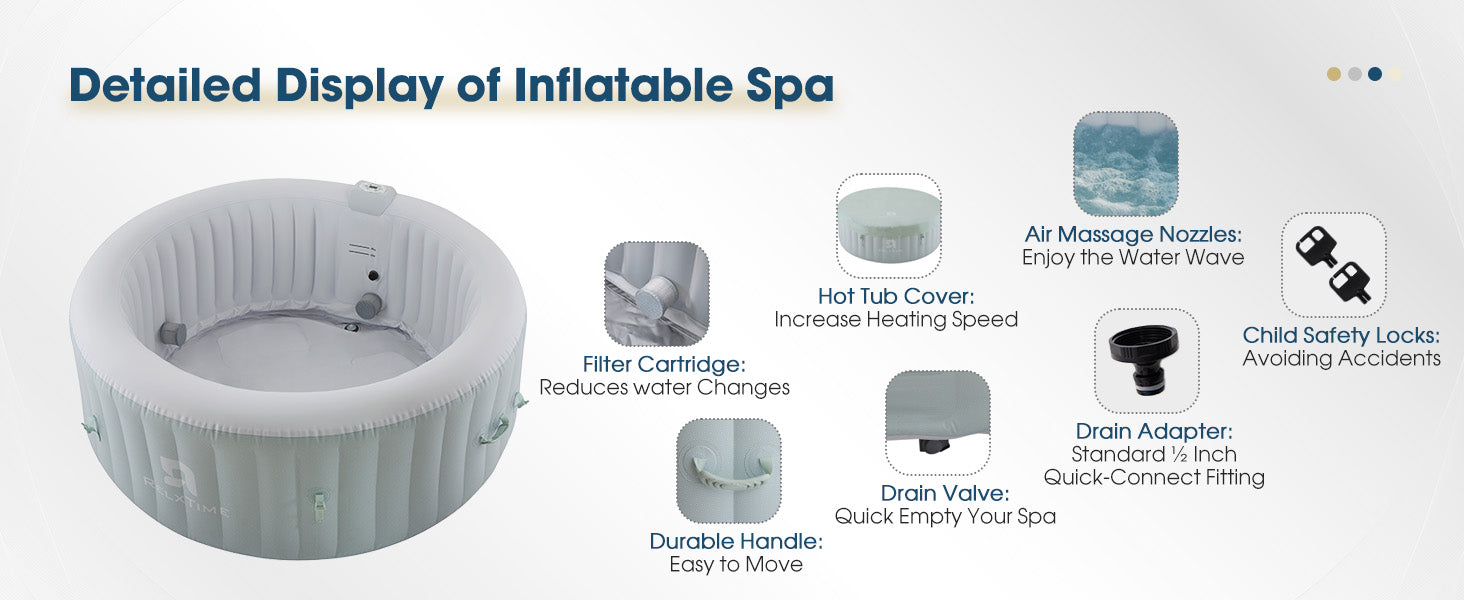 - 【QUALITY & DURABLE】Our inflatable hot tub is made of eco-friendly and durable 3-layer PVC material. The tub is equipped with an upgraded heating system, water filtration system and digital control panel for a comfortable and safe bathing experience.
