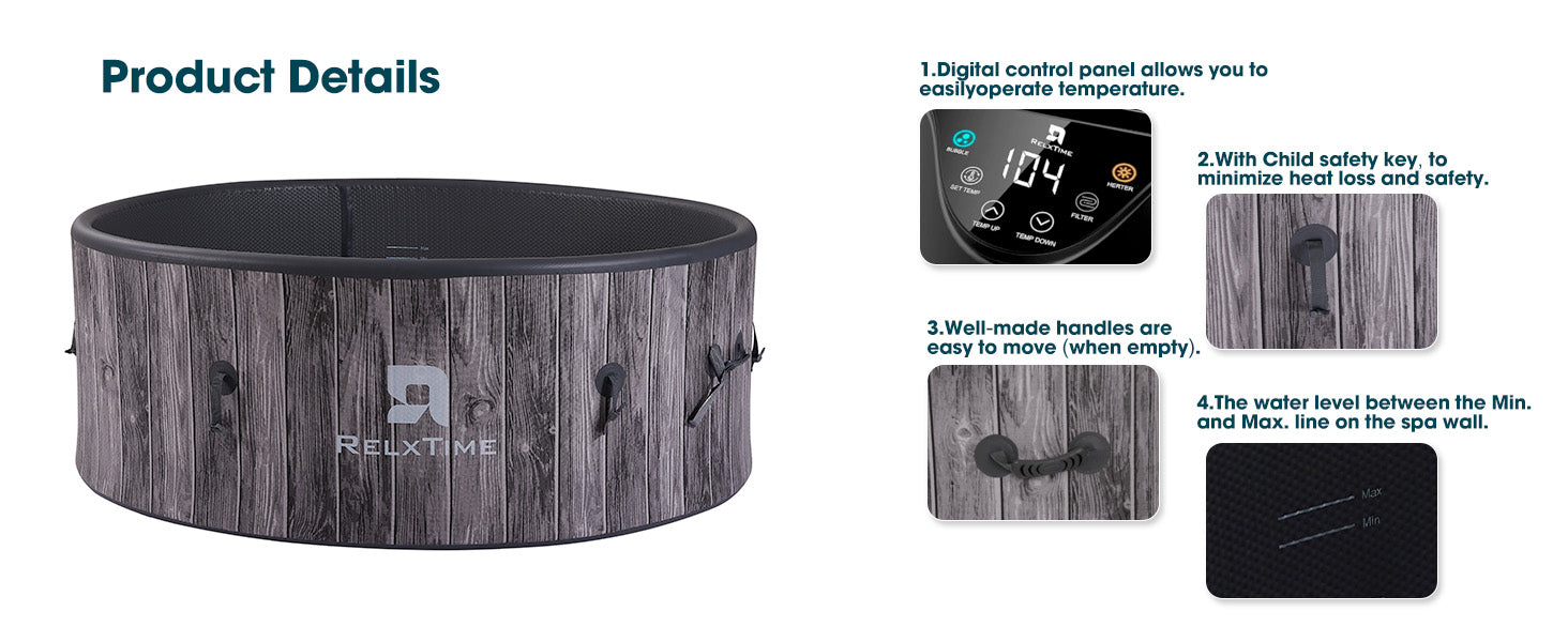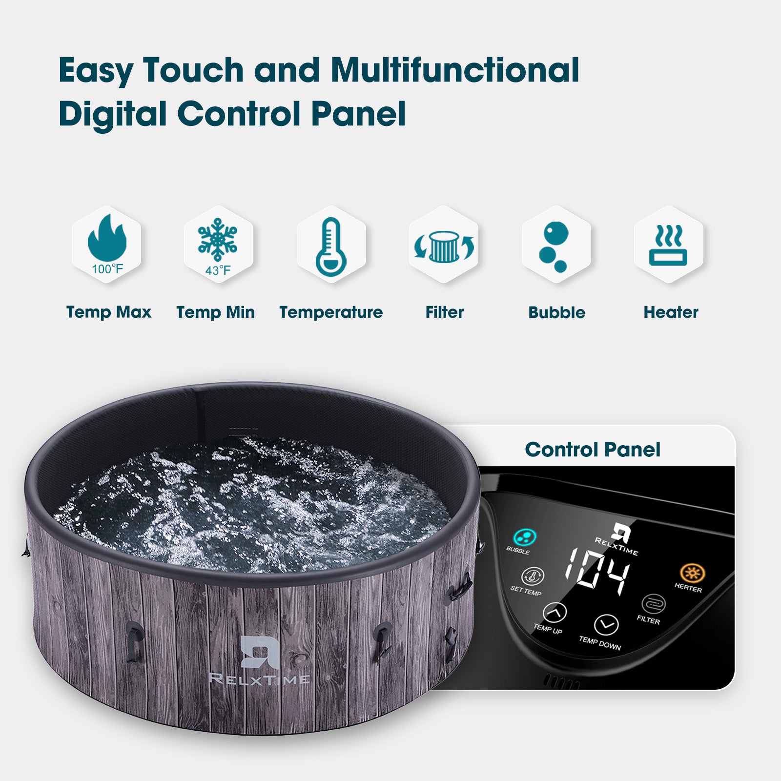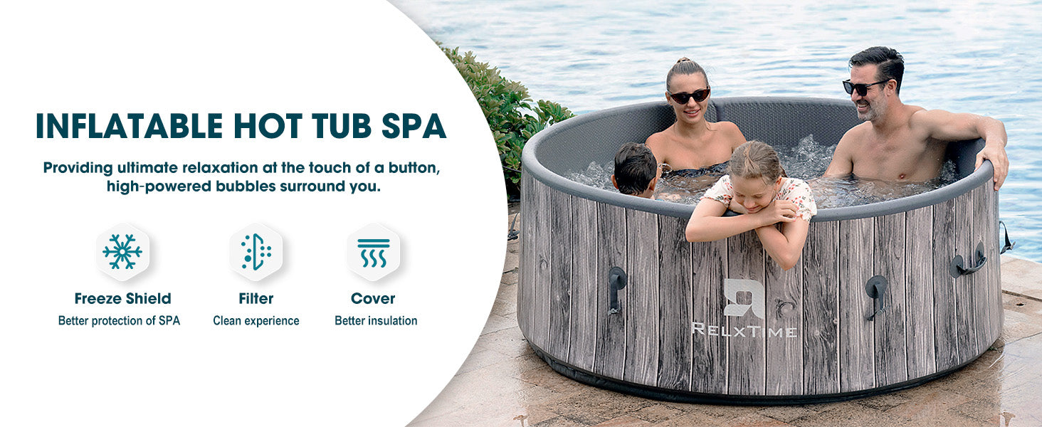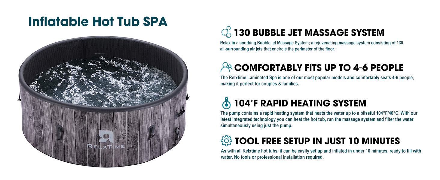 🌊HOT TUB WITH BUBBLE MASSAGE: The RELXTIME inflatable hot tub is made for up to 4-6 people and heats up to a soothing 104 °F (40 °C) with 130 surrounding powerful air bubbles, built-in integrated water filtration system to keep the water clean. Durable laminated PVC inflated walls for durability and comfort.