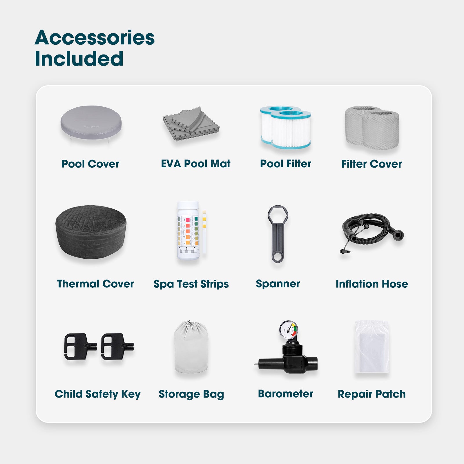 🌊COMPLETE PACKAGE, READY TO USE: All essential accessories are included—cover, filter cartridges, foot mat, cup holders, and more—so you can start enjoying your spa straight out of the box.