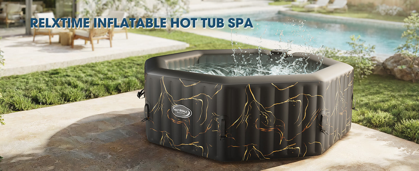Relxtime 4-6 Person Octagonal Black Gold Inflatable Hot Tub, Portable Outdoor Spa with 130 Soothing Bubble Jets, Insulated Cover, 2 Filter Cartridges - HJD6001