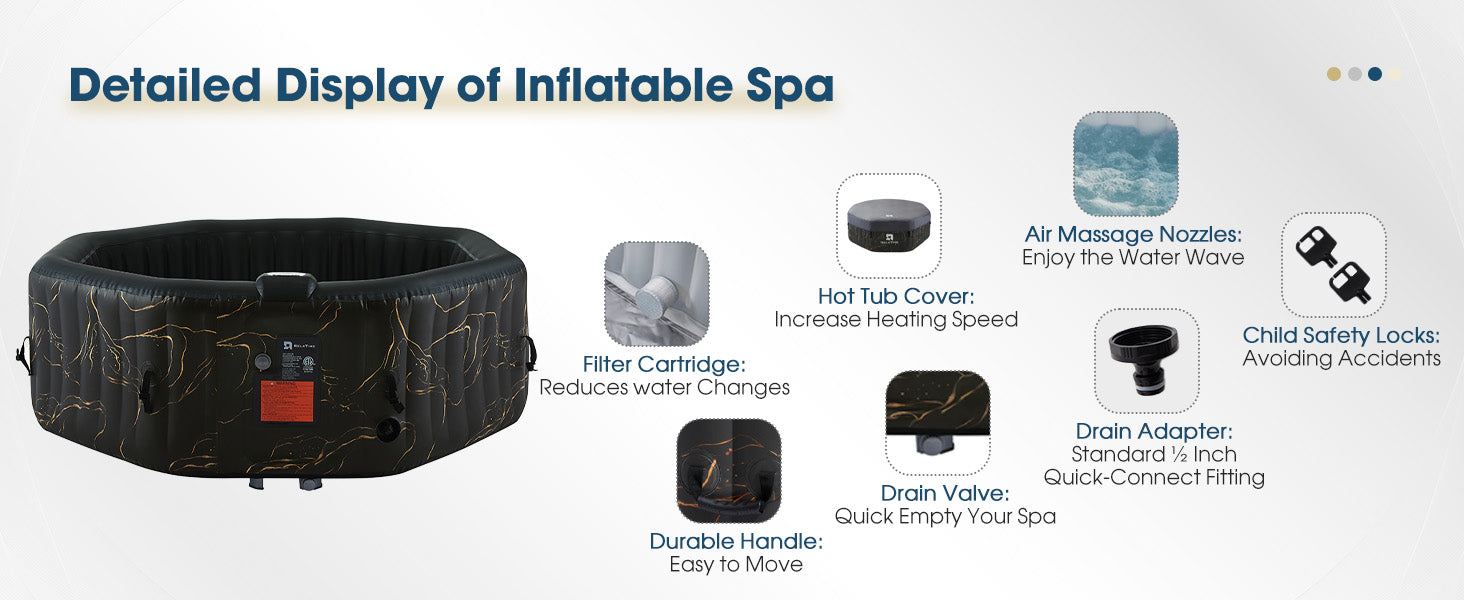 🌊EASY TO INSTALL AND CONTROL: The inflatable hot tub heats up to 104 °F(40°C) and features a quick heating system and easy-to-use digital control panel. You also get a pair of covered cartridges to help keep your water pure and free of debris.