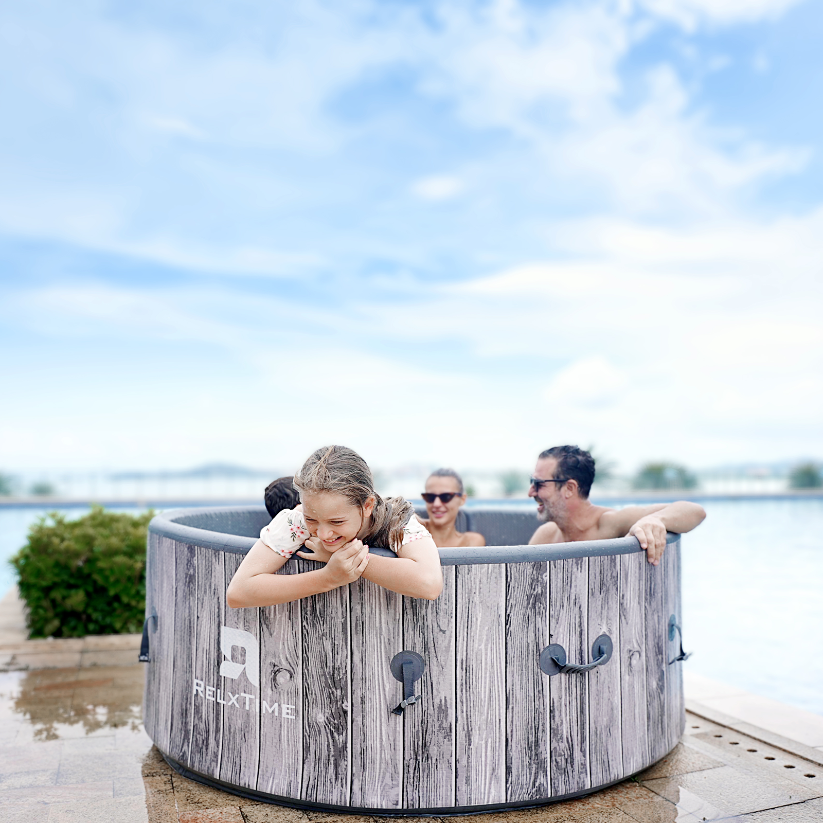 RELXTIME inflatable spa with soothing high-powered bubble jets and a built-in integrated water filtration system to keep the water inside clean.