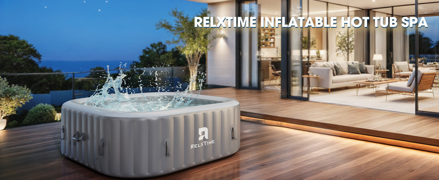 Upgraded Classic Grey Square Hot Tub – this enhanced 6-person inflatable spa features reinforced, triple-layer puncture-resistant PVC that keeps its shape and stability over time. Quick to set up and easy to maintain, it includes a complete accessory set for a seamless spa experience. Relax in comfort with soothing bubble jets and enjoy a durable, long-lasting spa right in your backyard.