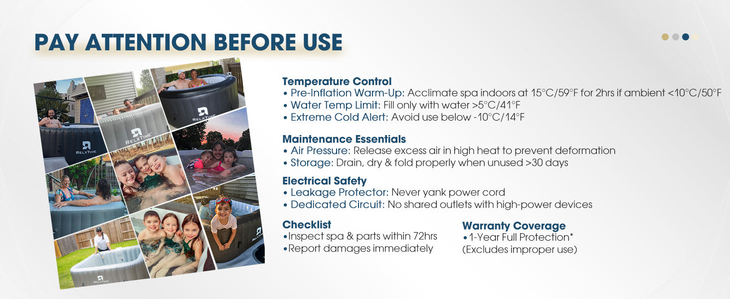 Note: Do not use the spa on sharp or rocky surfaces to prevent punctures. Do not leave the inflated spa under direct sunlight for extended periods to prevent the PVC from melting, expanding, or leaking. If the above situation occurs, Relxtime has the right to refuse warranty.