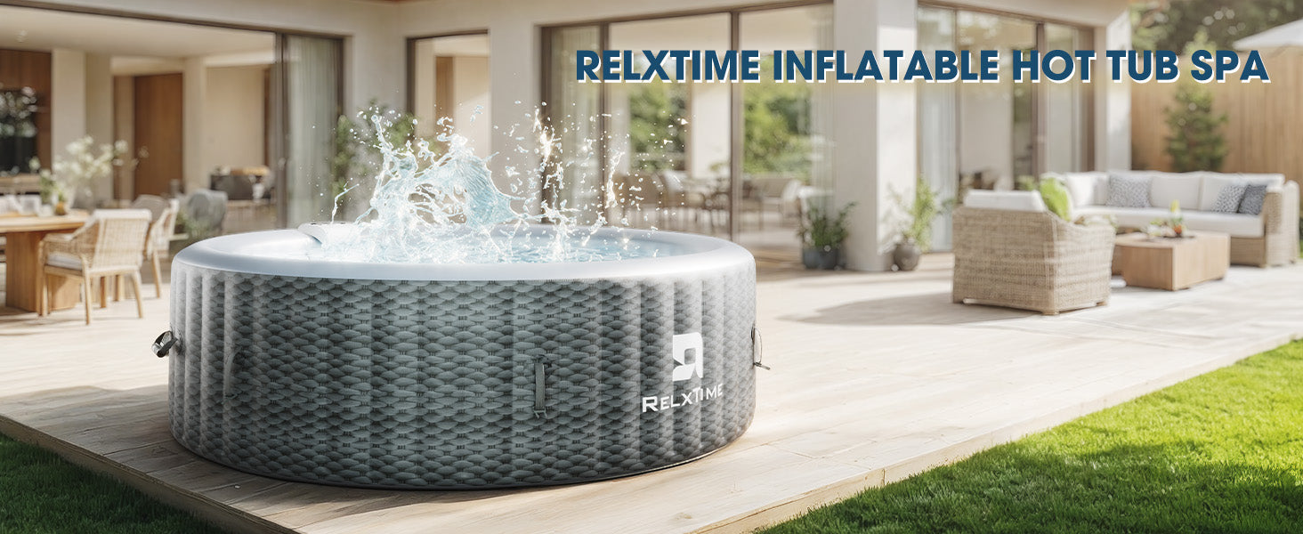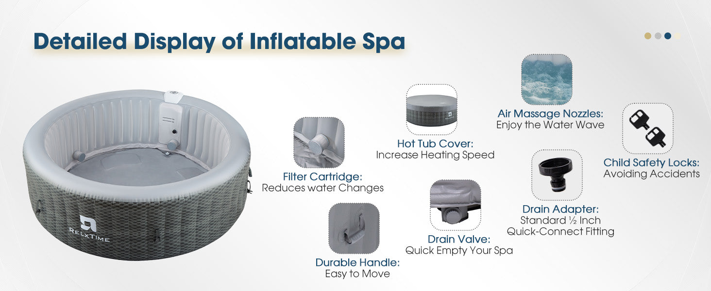 🌊4-6 Persons Inflatable Hot Tub: RELXTIME inflatable spa with 130 soothing high-powered bubble jets and a built-in integrated water filtration system to keep the water inside clean. The built-in 4-seat cushions that won't move, allow you to sit comfortably in the hot tub spa and avoid slipping.